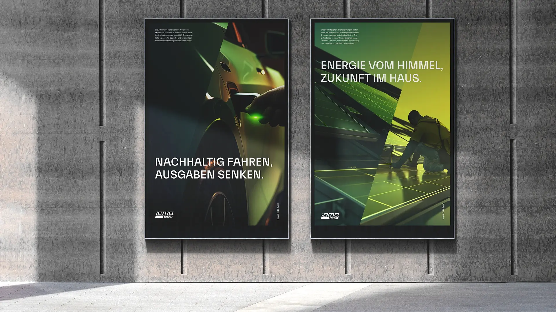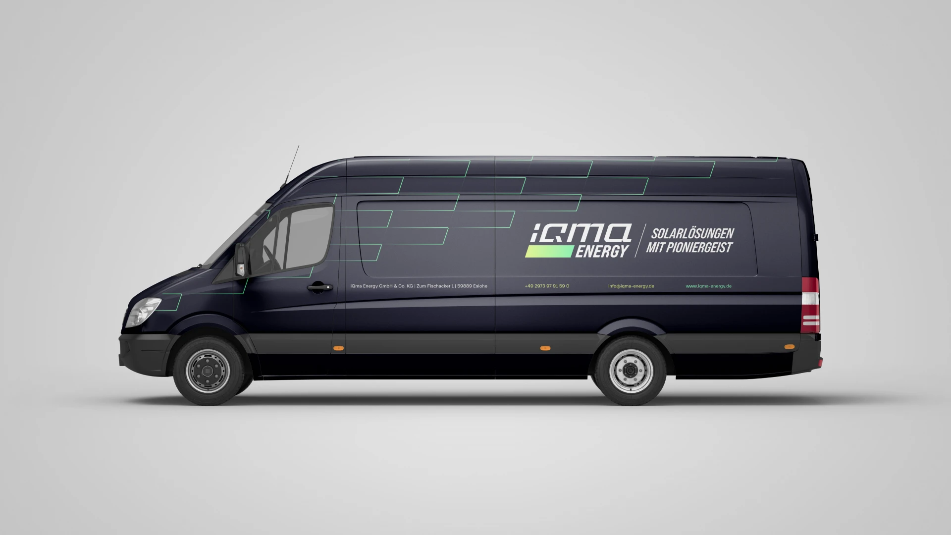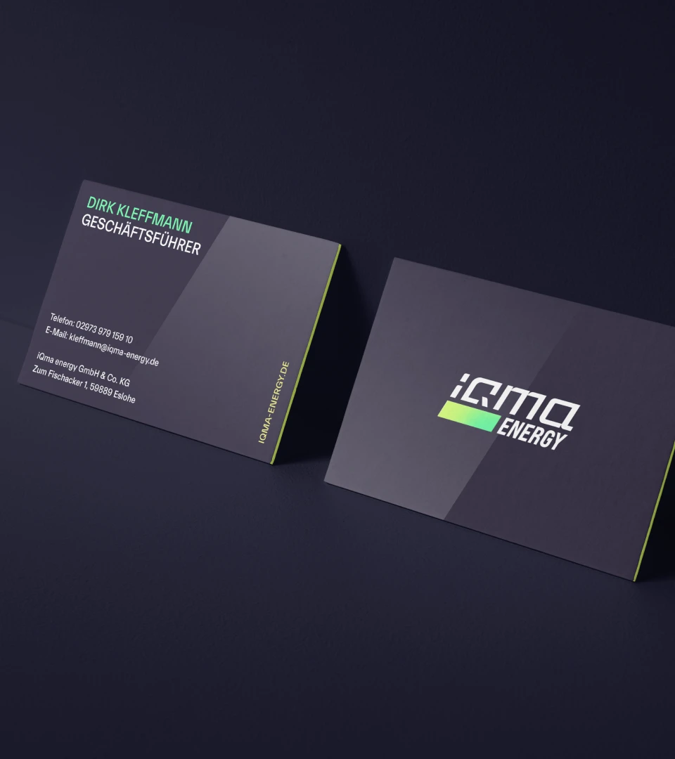 Überall dort, wo die Marke in Erscheinung tritt, zeigt der neue Auftritt seine klare, moderne Haltung. Präzise Linien, reduzierte Gestaltung und eine konsequente Anwendung der Markenelemente schaffen eine Wiedererkennung, die Präsenz zeigt. Vom kleinsten Detail bis zur großen Bühne entsteht ein Auftritt, der iQma Energy sichtbarer in der Branche macht.